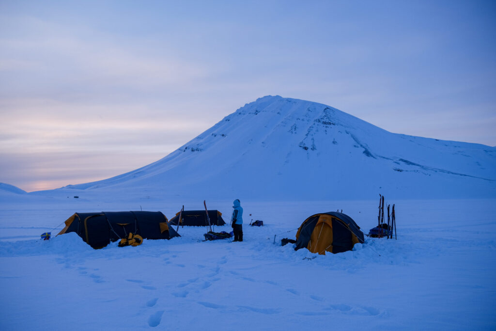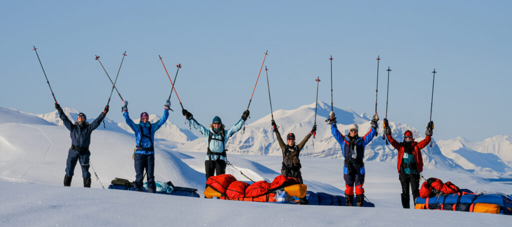 Crossing Svalbard – from Agardhbukta in the east to Kapp Linné in the west. With varying expedition experience in tow, the girls have covered 15-18 kilometers on skis daily for nine days. With approximately 40 kilograms of equipment in the pulk, plenty of energy and strength are needed to tackle both the weather and Arctic terrain. Navigating correctly in wind and whiteouts is crucial. And it’s essential to take turns breaking trail.